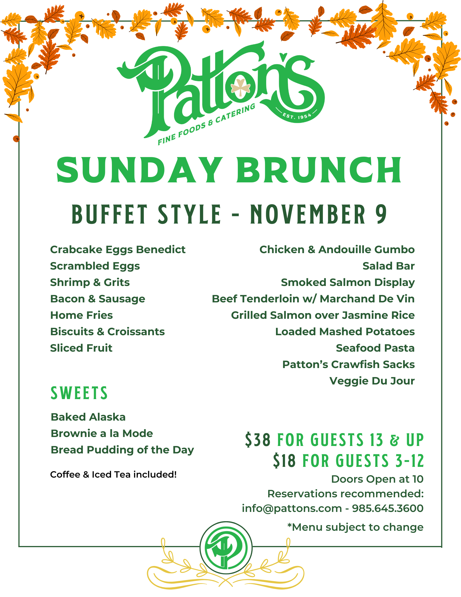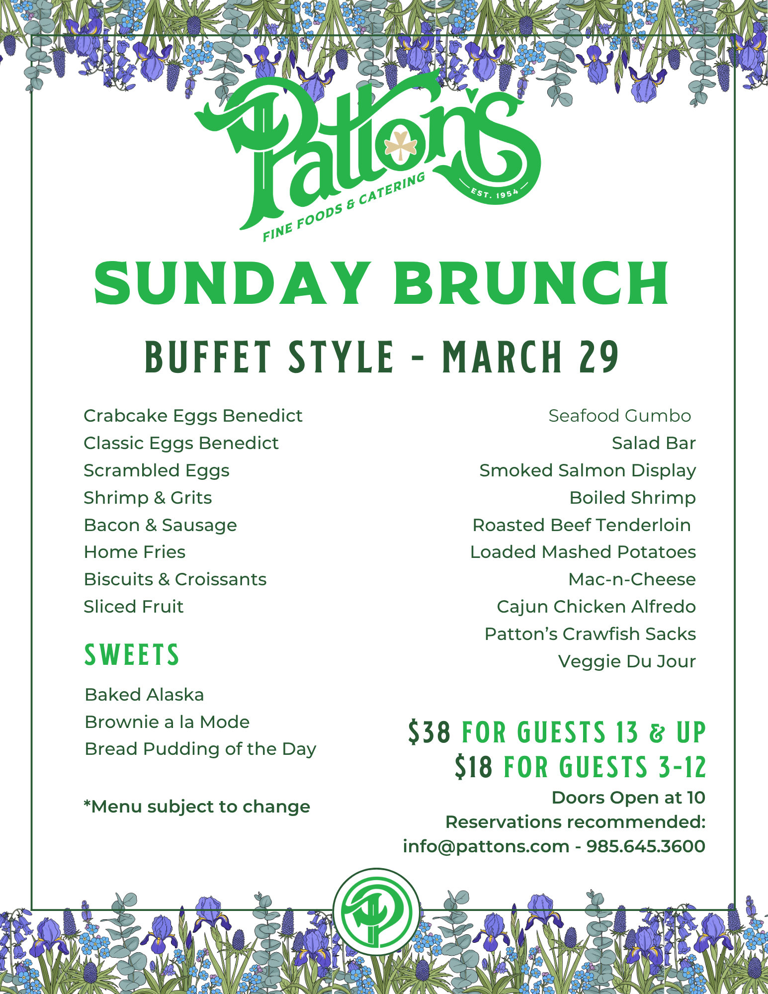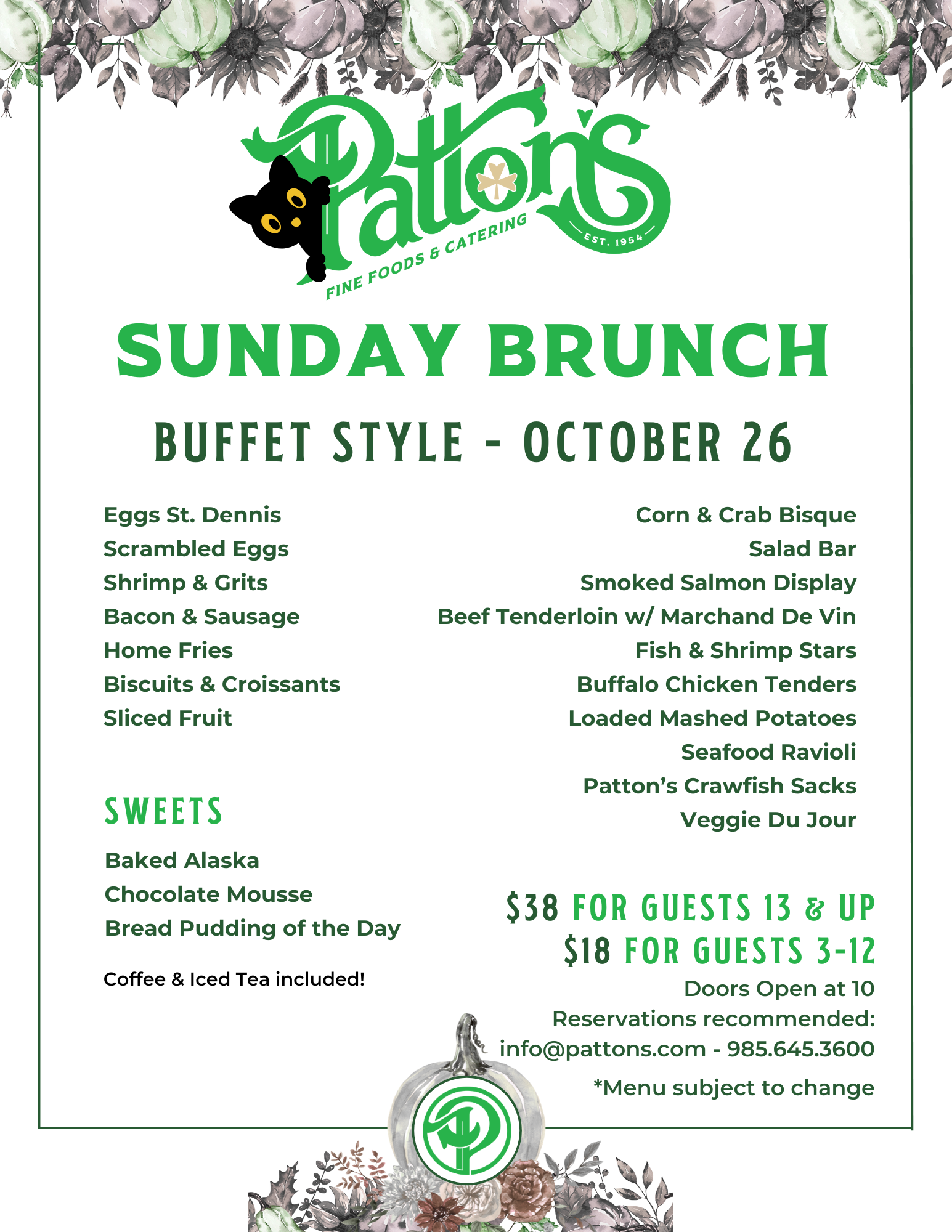 Sunday Brunch is back baby! We are so excited to invite our friends back to experience brunch Patton’s way. The menu changes slightly for every brunch date so please pay attention to our social media pages and/or this page for the new menu.